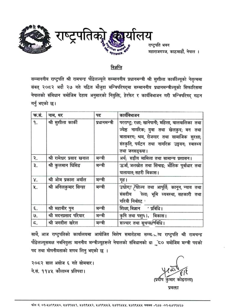 राष्ट्रपति पौडेलले प्रधानमन्त्री कार्कीको सिफारिसमा चारजना मन्त्रीलाई नियुक्त गर्दै मन्त्रालय तोकेका छन्।