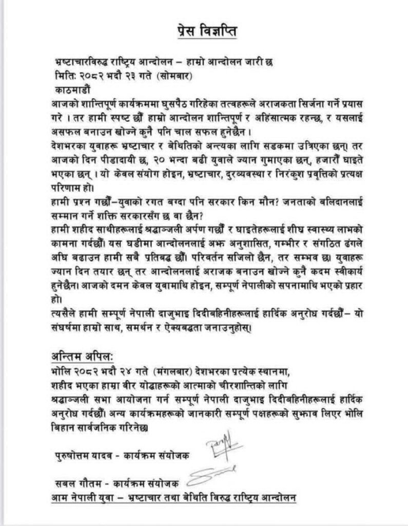 Gen-Z आन्दोलन : हिजो जारी गरिएको प्रेस विज्ञप्तिमा आन्दोलन निरन्तर रहने स्पष्टोक्ति, आज देशव्यापी श्रद्धाञ्जली सभाको आह्वान